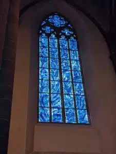 Die Französischkurse des 11. Jahrgangs waren am Freitag, den 06.06.25 in Mainz unterwegs, um der französischen Vergangenheit dieser Stadt näher zu kommen. Dazu hat eine Schülerinnengruppe im Vorhinein recherchiert und eine Rallye mit verschiedenen Aufgaben in französischer Sprache konzipiert. Der Ausflug führte uns unter Anderem zur Zitadelle mit den Vauban’schen Verteidigungsmauern, zu den blauen Fenstern von Marc Chagall in der Stephanskirche, zum Insitut Francais und zu einigen Spuren, die Napoléon Bonaparte in Mainz hinterlassen hat.
